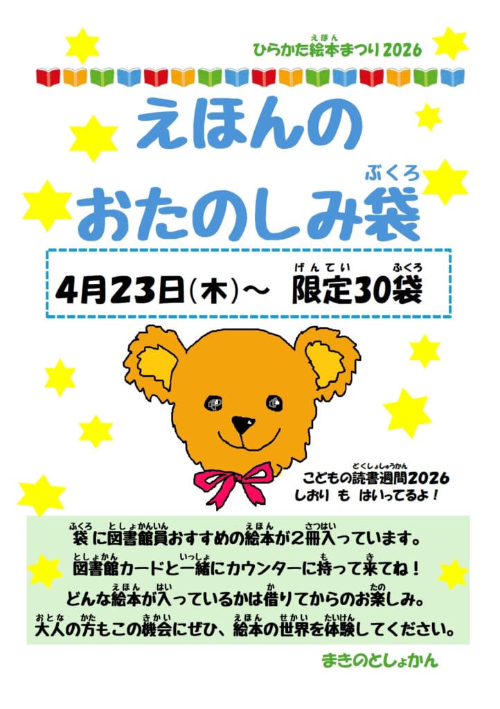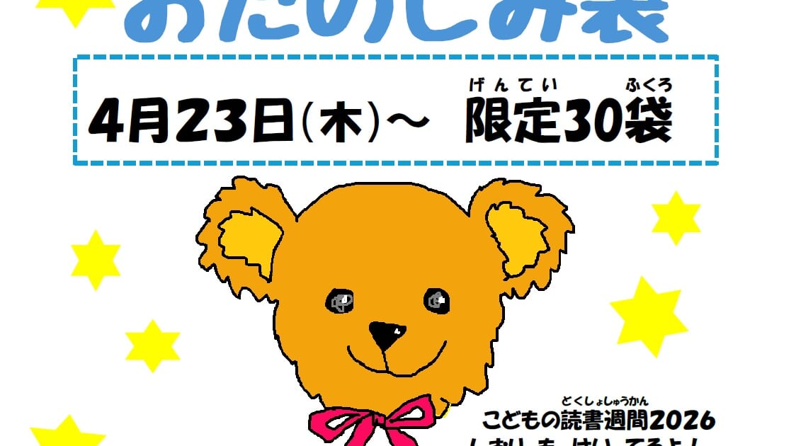 図書館内に、図書館員おすすめの絵本2冊が入った袋を用意しています。どんな絵本が入っているかは借りてからのお楽しみ!
