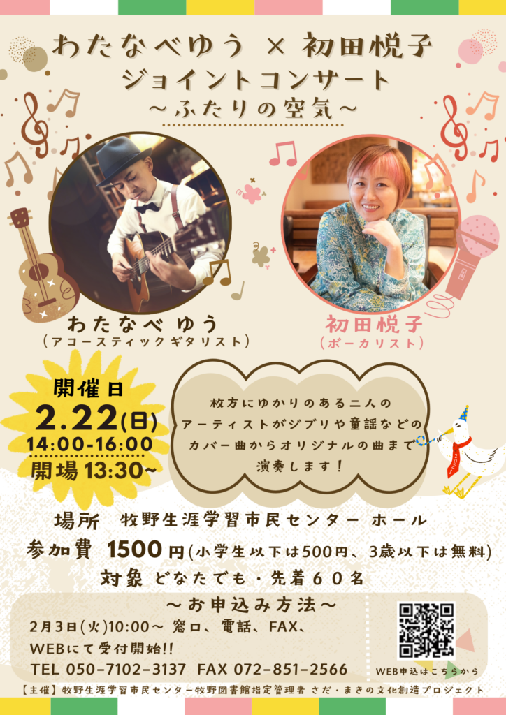 2階窓口、電話、FAX(氏名・電話番号・イベント名・お子様連れの方はお子様の年齢を明記)にて受付。