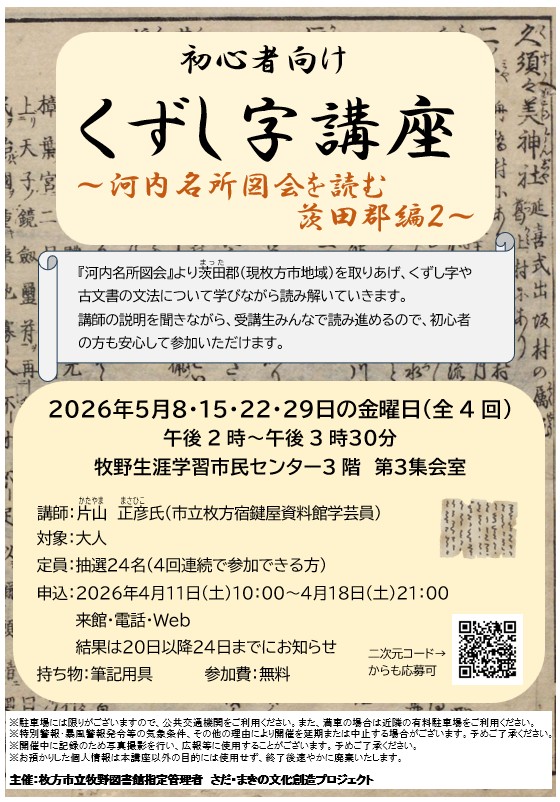 『河内名所図会』より茨田郡(現枚方市地域)を取りあげ、くずし字