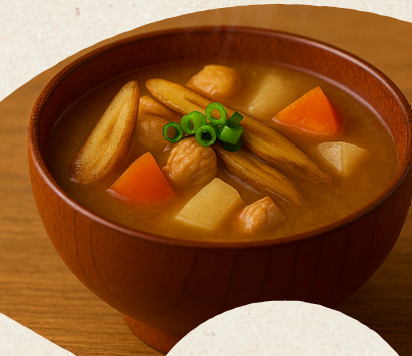 郷土料理について学んだ後、実際に「ごんぼ汁」を作りご飯と一緒に食します。
