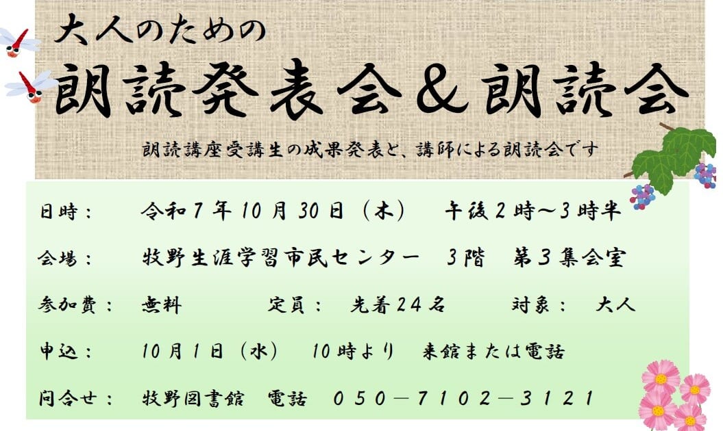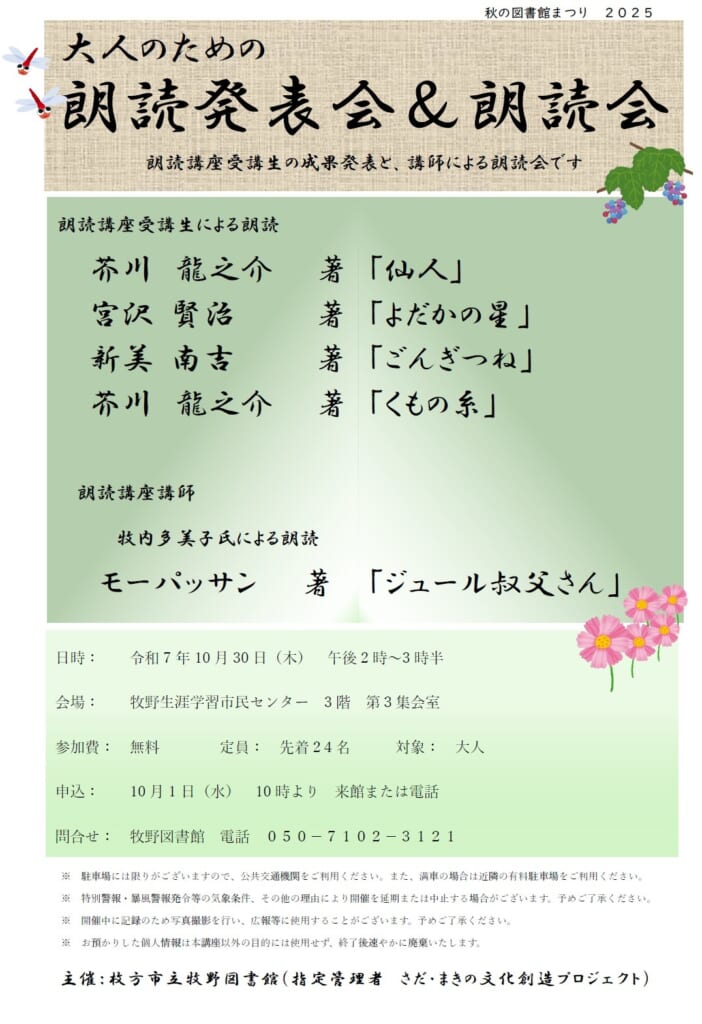 5月~9月に開催した「朗読を楽しむ講座」の受講生による朗読発表と講師の牧内多美子氏による朗読会です。読書の秋、朗読の世界をお楽しみください。