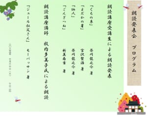 5月から9月に「朗読を楽しむ講座」で学ばれた受講生の内4名による朗読発表と講師の牧内多美子先生による朗読を皆さんで楽しみました。